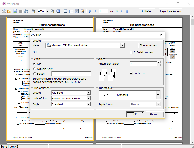 Im Auswahlfeld Druckmodus können Sie Seiten zu einer großen Seite zusammenfügen oder große Seiten aufteilen lassen. Bitte beachten Sie, dass der Fastreport die normalen Reporte seitenweise druckt. Das bedeutet konkret, dass erst die erste Seite eines gesamten Datenbestands (aller Einzeldatensätze) ausgedruckt wird, dann die zweite usw.